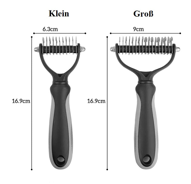 - Das doppelseitige Design dieser Unterfellbürste ermöglicht ein schnelleres Lösen von raunem und feinem Haar im Vergleich zu herkömmlichen Bürsten.